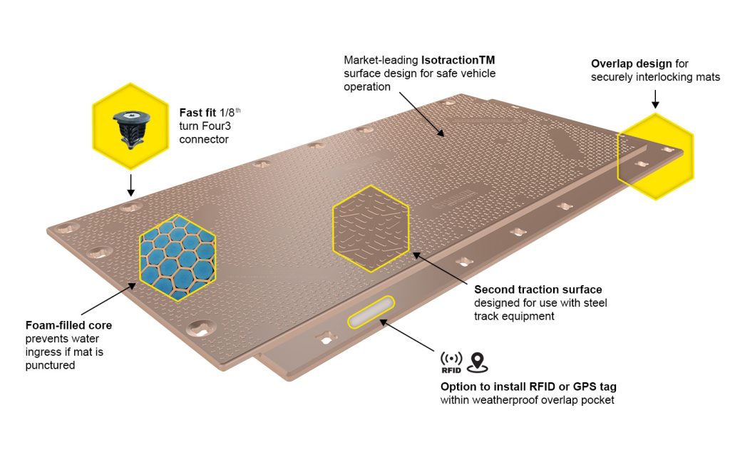 Isotrack X series advanced design provides temporary roads, work sites and staging areas where soft or boggy ground prevents safe access. Its cellular core can withstand high compressive loads (>605 psi) and the overlap and connection system creates a safe, continuous and stable work surface.