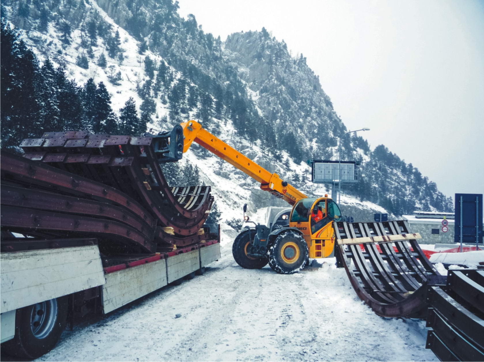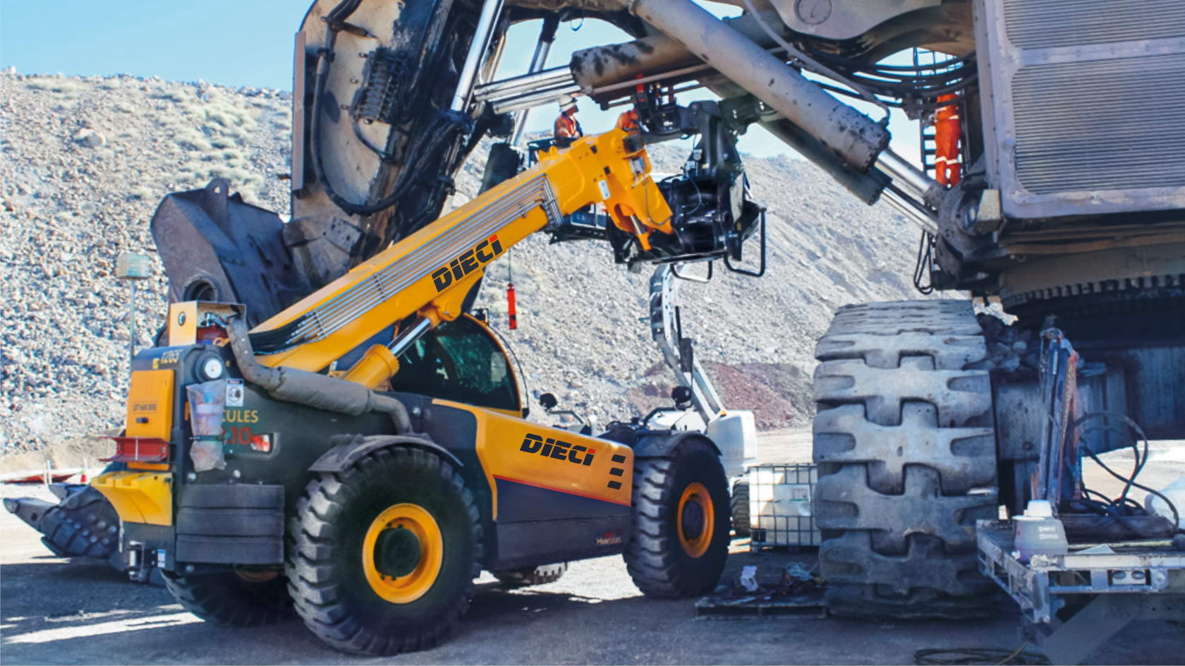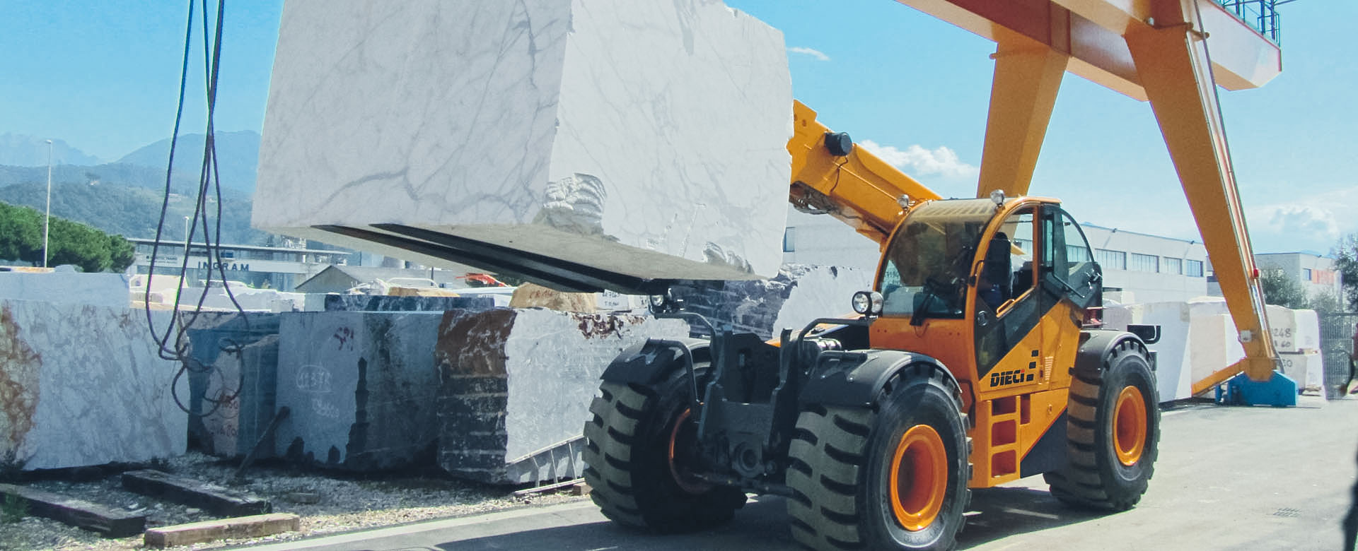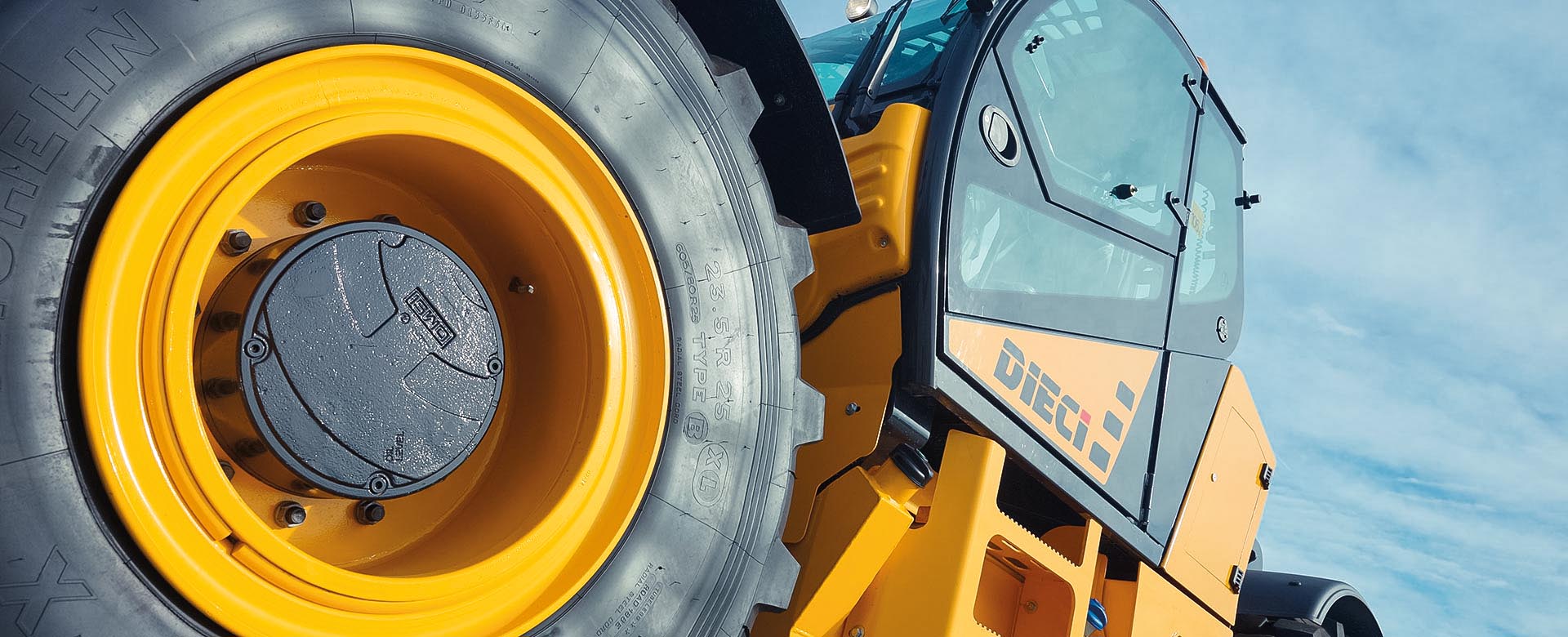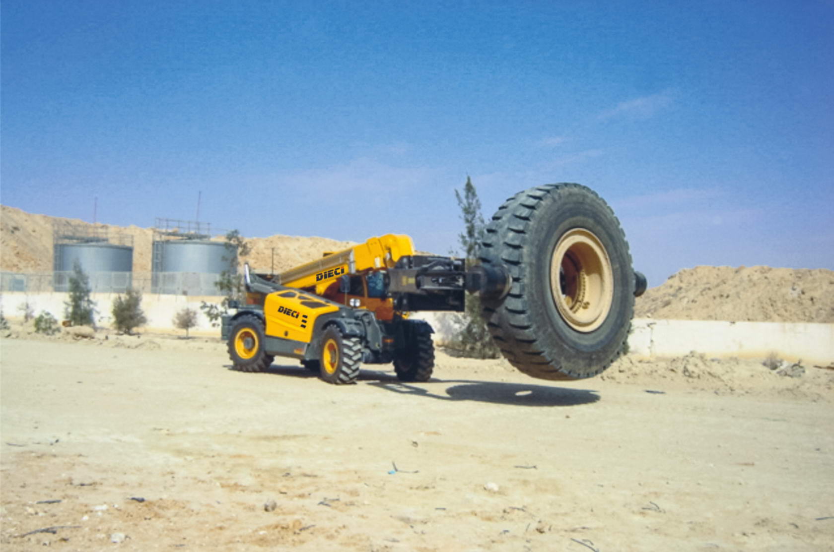 The Dieci telehandlers have been designed to use the various equipment needed to carry out all the work required by a construction site: forks, loaders, lifting hooks, jibs with winches, grippers, material baskets, mixing buckets, concrete ladles, sweepers, salt spreader, snowplow blades.