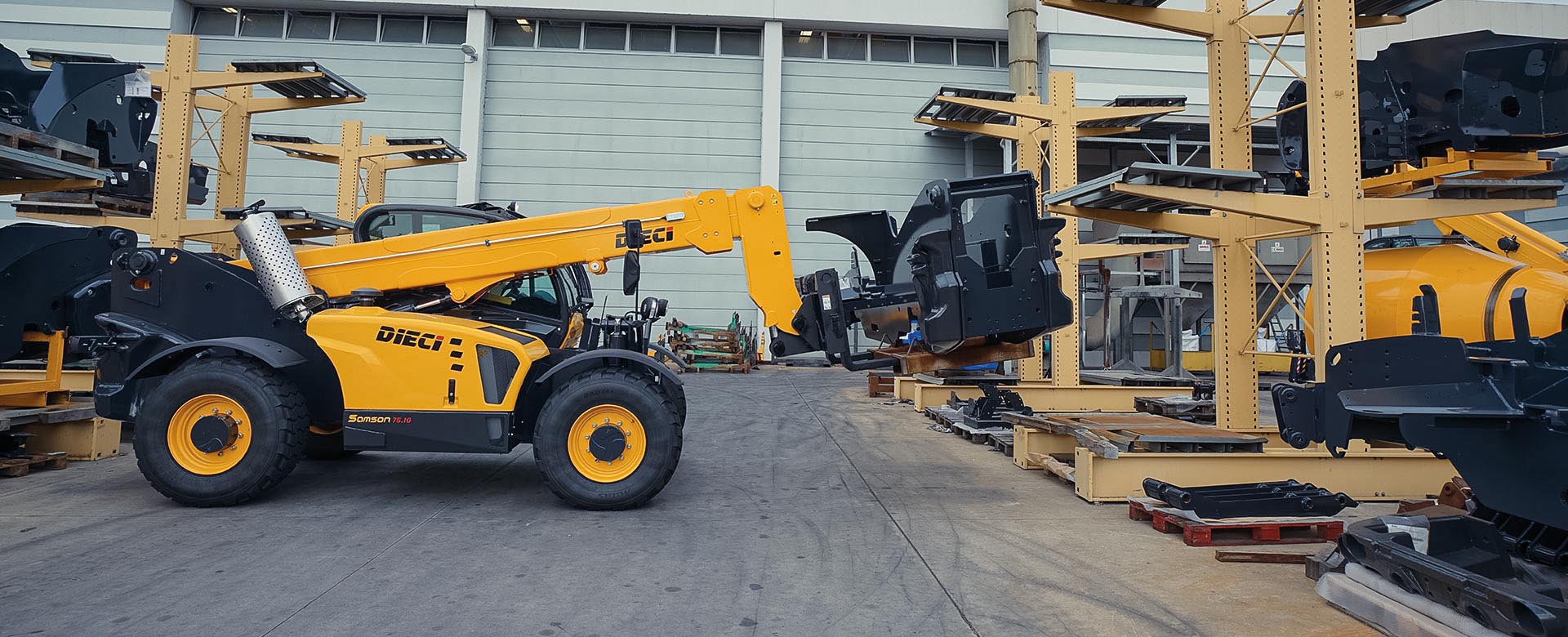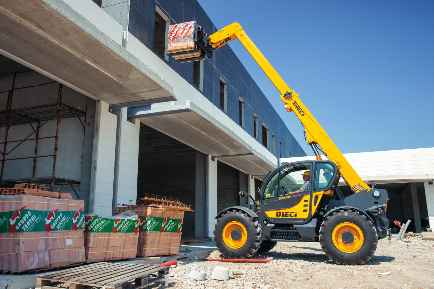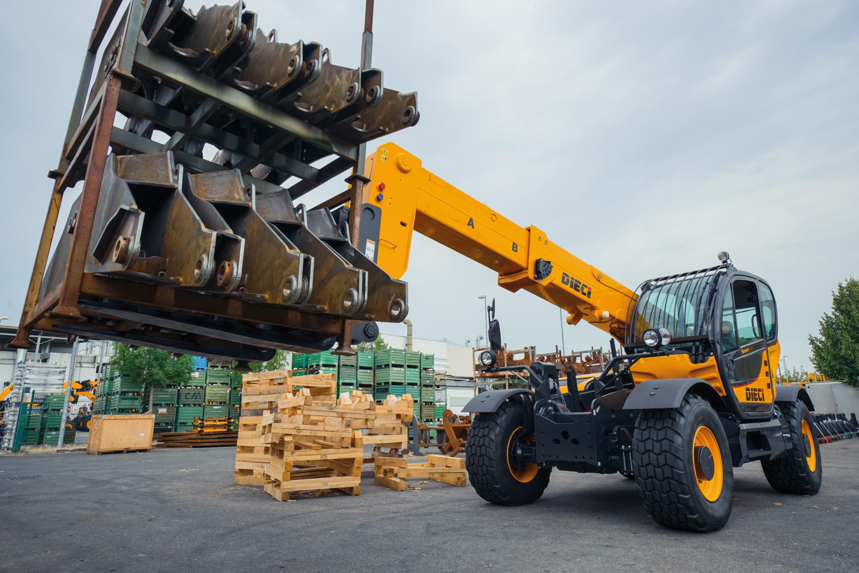 The Dieci telehandlers have been designed to use the various equipment needed to carry out all the work required by a construction site: forks, loaders, lifting hooks, jibs with winches, grippers, material baskets, mixing buckets, concrete ladles, sweepers, salt spreader, snowplow blades.